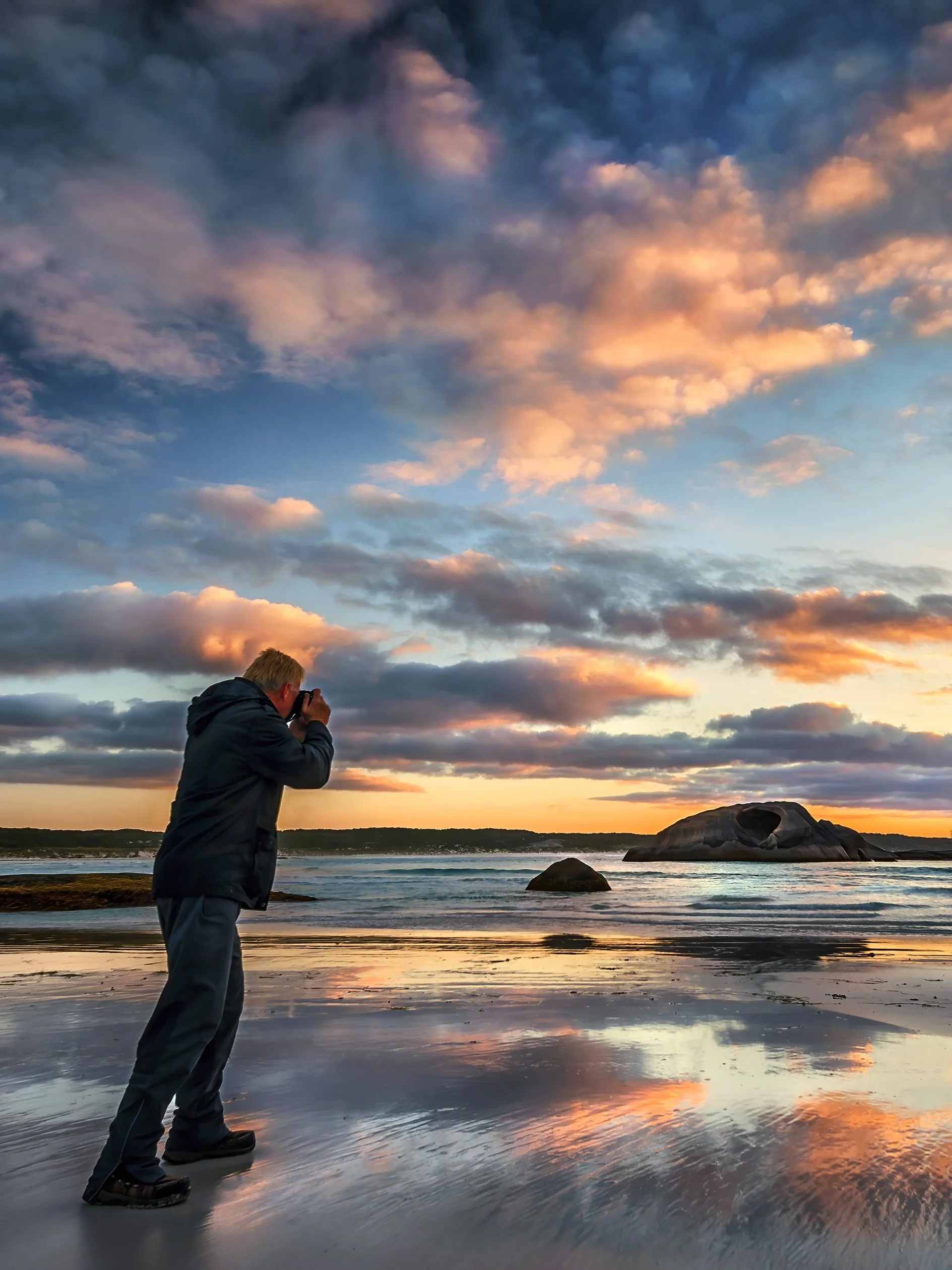 These days, you rarely find him without a camera (or two) in hand, often found knee-deep in the Southern Ocean or waiting in the sand at Twilight Beach, chasing the light.
